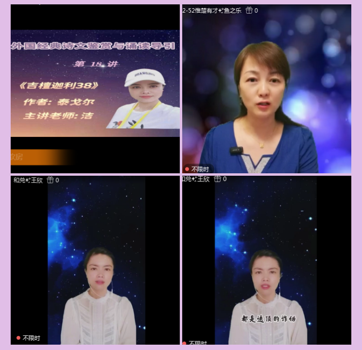 声音之美,再现经典。经典诗歌《吉檀迦利38》写到:我需要你,只需要你,让我的心不停地重复这呼喊,日夜引诱着我的种种欲望,是彻头彻尾的欺诈与虚空。 就像这黑夜,隐藏在祈求光明的昏暗之中。我的潜意识深处也在呼喊,我需要你,只需要你。如同尽管风暴竭尽全力打破平静,却依然在平静之中寻找它的归宿。即便我的反叛在抵触你的爱,而它发出的呼声,却依然是,我需要你,只需要你。讲座结束后,诵友水上银花、琪琪格先后上麦,学习诵读了《吉檀迦利38》。洁老师对她们的诵读做了细致入微的点评和指导。读进去了,感受神人合一的“放大的舒畅”;触碰的结果是:发现自己,情感升华,信念纯净。一个自由美好的乐园浮现在眼前同时,你的思绪,你的“只可意会”的想法在文字中飞翔自由、驰骋梦想。快乐的时光总是短暂。《经典外国诗文鉴赏与诵读导引》活动,在主持的美好祝愿声中圆满结束。
