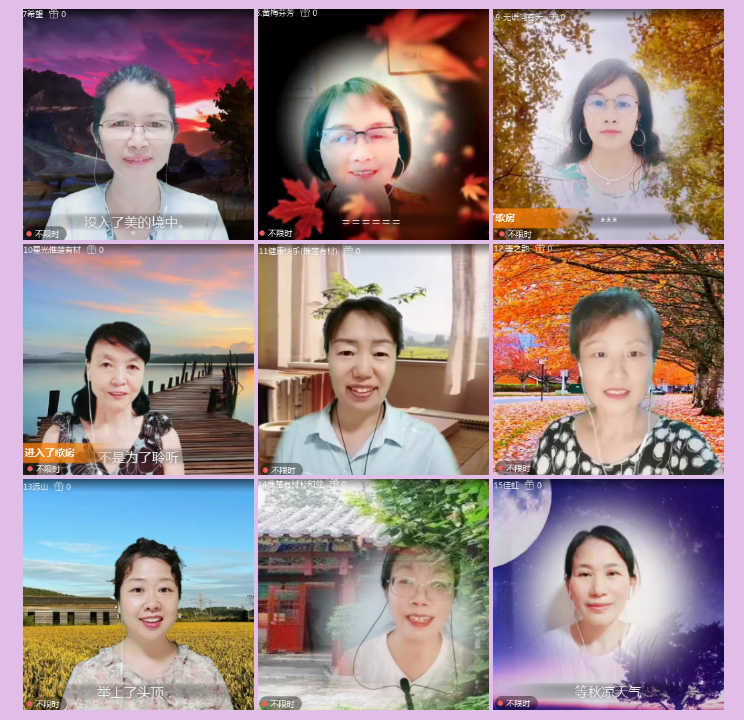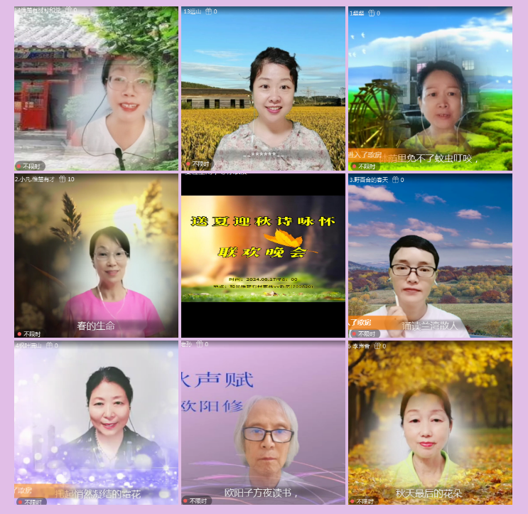 依依不舍,夏的激情乐章,悠然在耳畔回响。岁月如梭,秋的芬芳悄然扑面而来,肆意着梦想成真。秋天是壮丽的诗,秋天是动人的歌。诵读晚会上还欣赏到:无语问苍天朗诵《秋天的怀念》、星光朗诵《黄昏里的琴声》、健康快乐朗诵《翻阅阳光》、墨之韵朗诵《写给秋的诗》、远山朗诵《听秋》、心语朗诵《北平的夏天》、佳虹《等秋凉天气》。当大家还陶醉在“秋的诗意”中的时候,诵读晚会在主持远山的温情答谢与美好祝愿中,圆满地落下了帷幕。