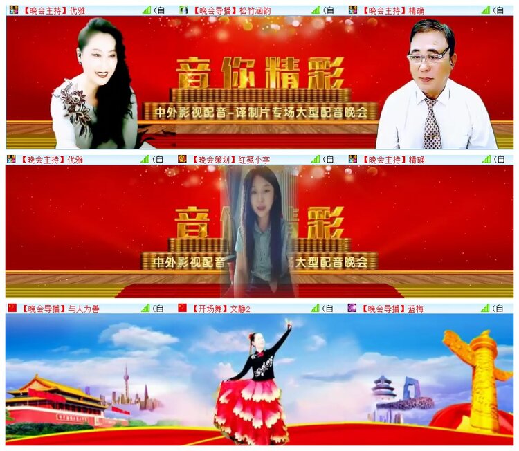 当晚北京时间19:30,悠扬的出旋律中,晚会主持精确、优雅携手走上中外影视配音房间视频舞台,热情欢迎新老朋友光临晚会现场。诗意秋天,浪漫八月。迎来了“音你精彩”为主题的译制片专场大型配音晚会,让我们走进外国经典影视,一起欣赏才艺嘉宾们带来的精彩配音,共享译制片配音的艺术风采和魅力,共度一个温馨浪漫的秋日之夜。朗诵艺术专区领导影儿上麦发表了热情洋溢的讲话,并预祝晚会圆满成功。中外影视配音室主红笺小字致答谢词,向关注和热爱配音艺术的朋友们表达了一份深深的谢意。晚会分《译之音》《声之魅》《群英荟萃完美之外》三个篇章张开,伴随着文静带来的开场舞蹈《美丽中国》,开启了晚会精彩的序幕。