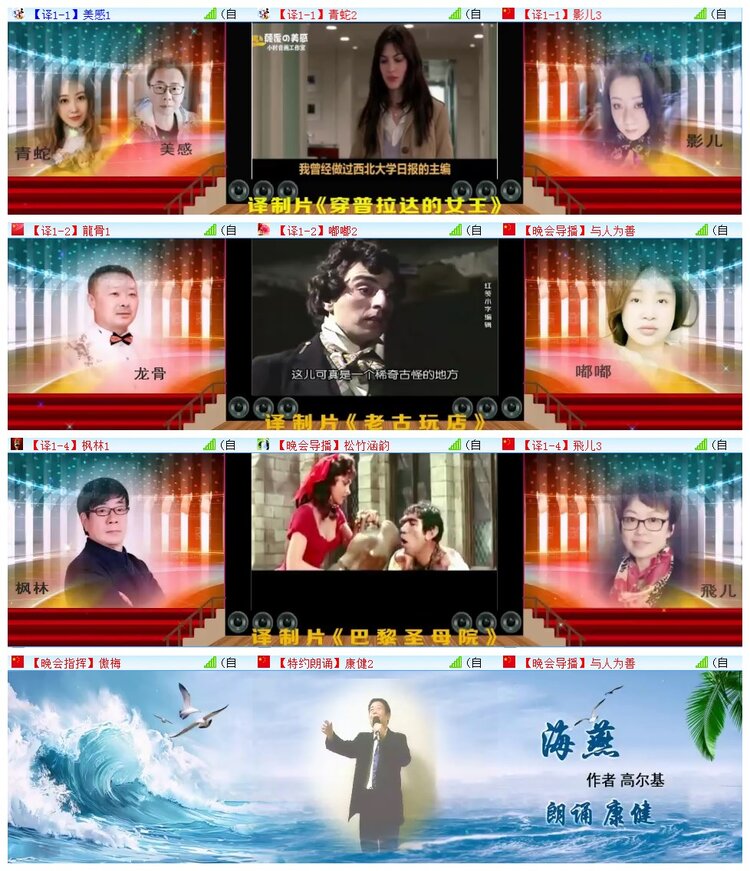 ( P& _8 l# n$ a. m: n* u* [+ a9 A 温馨相约,欣赏外国经典影视;浪漫相聚,共享听觉的饕殄盛宴。晚会进入第三篇章《群音荟萃完美中外》:宁静致远 苏堤 沧海带来配音选段《译制片·威尼斯面包师的儿子》、书名号、简、冰岩带来配音选段《译制片·傲慢与偏见》,不冷、淙淙小溪、小火柴带来配音选段《译制片·遗产大战》、特约嘉宾·指点江山看风景、青衣合诵《中国心》、学而雅、无忧、品声赏读带来配音选段《译制片·茜茜公主》,演绎了最后的精彩。配音艺术是通过声音的表现力塑造形象和情感并且在人物性格,语言习惯,地域文化等方面实现准确表达。经典译制片专场配音晚会的成功举办,正是对配音艺术的又一次新探索和新创举。历时近3个小时,晚会在主持的美好祝愿中圆满结束。 房间路径 聊天大厅->朗诵艺术->中外影视配音[电信] 房间ID:732008 - t% X* ]+ T \' a9 ?" X
