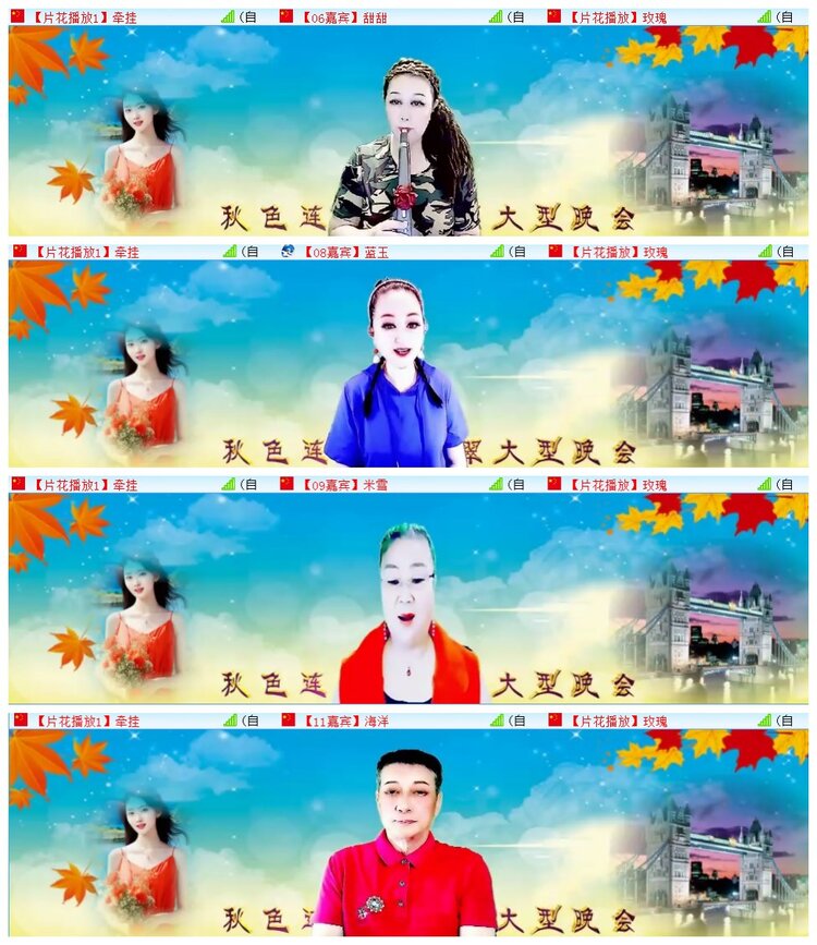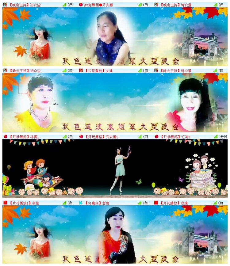 ( d: c. t( V1 l/ C 秋风送爽,丰收在望。诗意九月,放飞音乐的梦想。晚会下半场,大家欣赏到:嘉宾涵涵演唱歌曲《歌声里的回忆》《心如月亮一样真》、嘉宾蓝玉演唱歌曲《知青之歌》《为了谁》、米雪演唱歌曲《东北菜东北味》《人的命天注定》、嘉宾海航演唱歌曲《缘份是一杯酒》《迟来的爱》、嘉宾海洋朗诵配乐美文《青春中国》、嘉宾潇湘演唱歌曲《想你想到心里头》《又见山里红》。相约在网络,开心在九月,相聚在VV,快乐在金秋。历时2个小时,晚会在主持的美好祝愿中完美落幕。