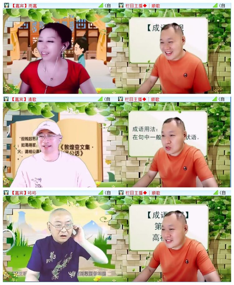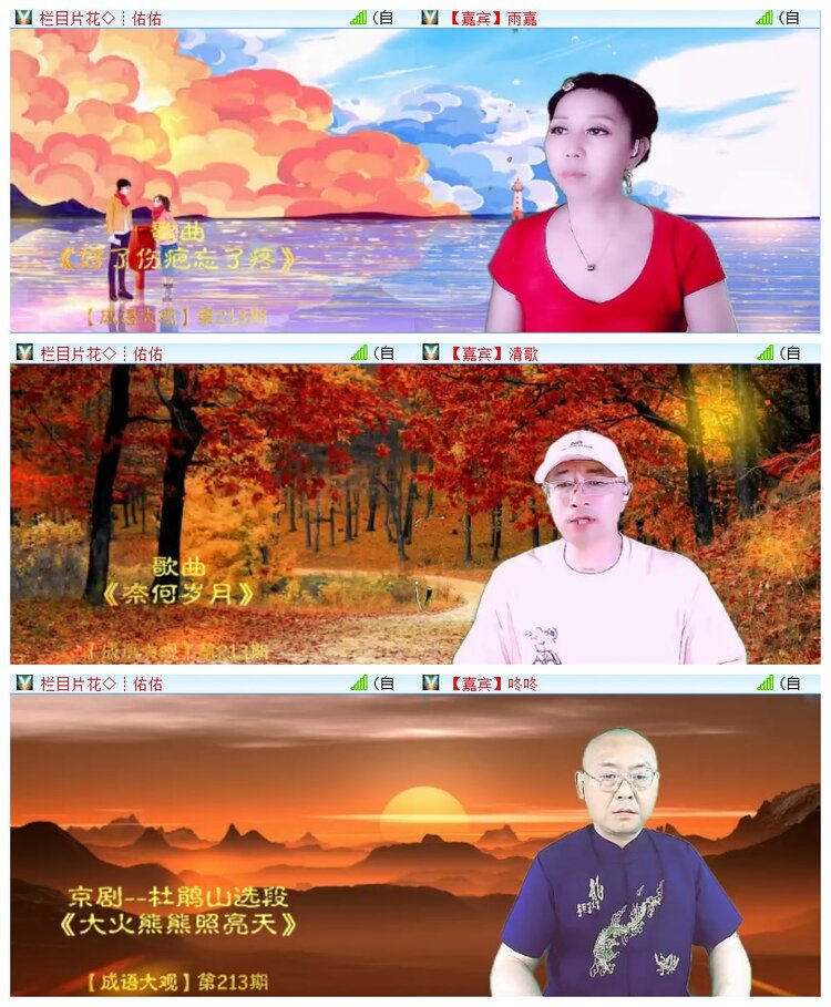 " y, I4 e8 A6 W4 p! E 共享音乐美好,共度游戏时光。VV官方艺术团的才艺嘉宾,全程助阵栏目:雨嘉演唱歌曲《想你心已碎》《好了伤疤忘了疼》、清歌演唱歌曲《你的万水千山》《奈何岁月》、咚咚演唱京剧选段《杜鹃山选段大火熊熊照亮天》《将相和选段在金殿定官职是非难辨》。进入闯关游戏环节,三位嘉宾上麦参与互动,为大家做出了闯关示范。热心观众纷纷上麦,呼朋唤友组团前来闯关,赢得成语接龙奖品VIP红号和水晶会员。大家在开心游戏中,共度了一段快乐时光。烟花绽放中本期《成语大观》圆满结束。