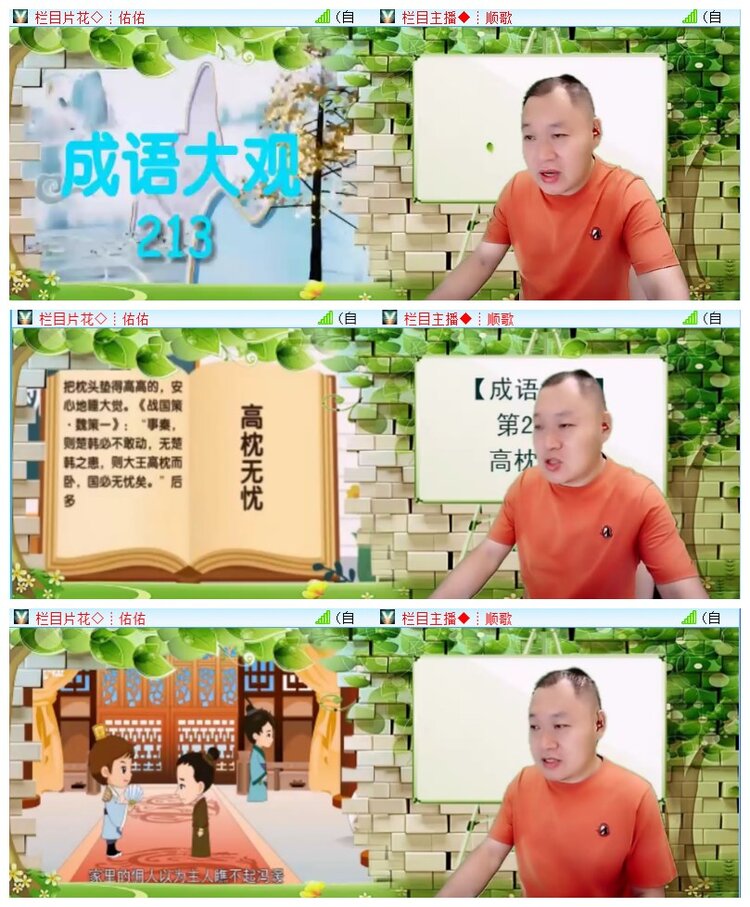 6 E* i! }2 J3 [) M 当晚八点整,悠扬的旋律中,主播顺歌走进开心周末直播间,开启了《成语大观》栏目的精彩之旅。主播为大家推荐学习的成语是:高枕无忧。“高枕无忧” 字面上理解,就是把枕头垫得高高的,然后安心地睡觉,没有任何忧虑。“完成了这项艰巨的任务后,他终于可以高枕无忧地休息几天了。该成语出自《战国策·魏策一》其中记载到,事秦,则楚韩必不敢动,无楚韩之患,则大王高枕而卧,国必无忧矣。这是该成语的出处之一。成语的汉民族文化的瑰宝,七言简意赅,妙语连珠,常用应用于口语和书面语中,生活中达到效果是妙不可言。也因此成语被越来越多的人喜爱。
