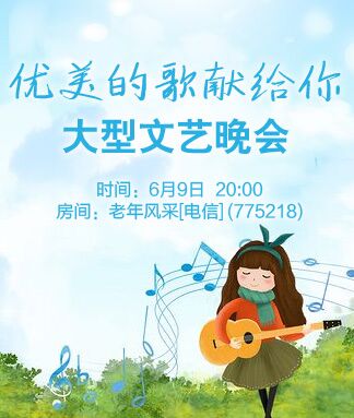 。 踏着岁月的鼓点,我们走进六月,和着时代的节拍,我们歌唱六月。大地飞歌,,春风又绿伊水两岸。诗情澎湃,百花开遍VV跨界大舞台。晚会中我们欣赏到:蝶舞演唱歌曲《天蓝蓝》、楚楓演唱歌曲《最远的你是我最近的爱》、冰涵演唱歌曲《爱在天地间》、香香演唱歌曲《草原夜色美》、幸运演唱歌曲《故乡情》、紫沫演唱 歌曲《长相依》、旋律演唱 歌曲《我祝祖国三杯酒》、知音演唱歌曲《相逢是首歌》、拧晚葫芦丝演奏《篝火狂欢夜》。