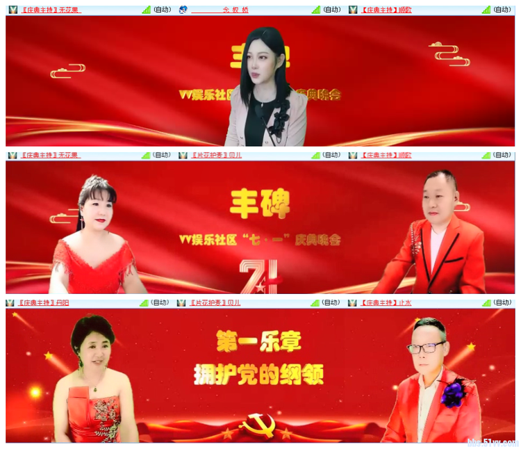 , g+ Q3 o7 O) U1 l/ | 晚八点整,烟花绽放中,舞星天天、弦子表演的民族舞《再唱山歌给党听》舞上视频舞台,为庆典晚会喜庆开篇,庆典主持顺歌、无花果、止水、丹阳先后为晚会领航,VV副站长、VV官方宣传部、推广部、活动部部长、VV官方记者部总编念奴娇女士,为晚会致贺词,生吾炎黄,育我华夏。待之有为,必报中华。祝福我亲爱的祖国,永永远远朝气蓬勃,祝愿祖国越来越好,越来越强大我以自己是中国人而自豪。今晚让我们用歌舞谱写劳动者华美的诗篇,用激情传承中华民族的传统美德,用豪迈的歌声,精湛的演技,在同景独好的VV跨界大舞台,开创我们更加灿烂美好的未来。晚会围绕《拥护党的纲领》《遵守党的章程》《履行党员义务》《执行党的决定》四个篇章展开。