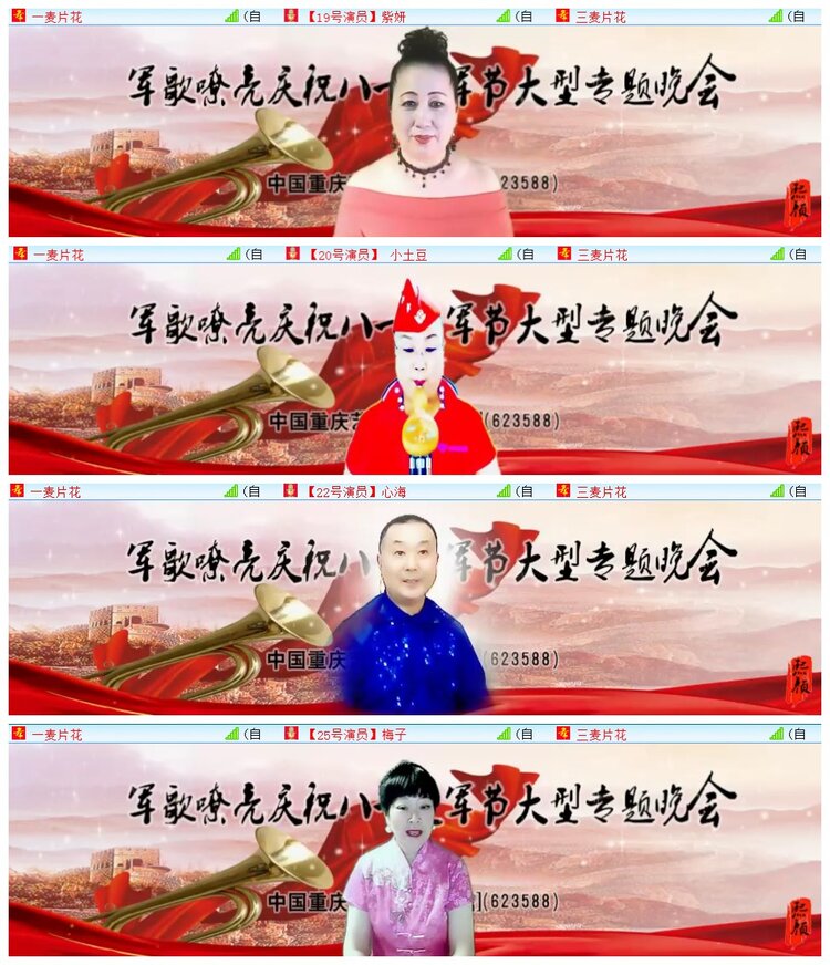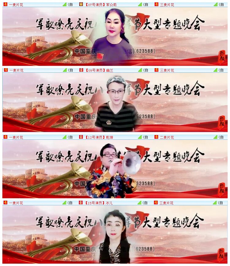 相聚VV,纪念八一建军节,铭记97年峥嵘岁月。不忘初心,牢记历史,弘扬爱国主义精神。晚会上半场大家欣赏到的是:春妍演唱歌曲 《绣红旗》,大猫演唱歌曲 《蓝蓝的天蓝蓝的海》,思念演唱歌曲《我的祖国》,蓝莓演唱歌曲《兵哥哥》,茯苓演唱歌曲《妻子》,小帅带来口琴独奏《十送红军》,军莉演唱歌曲《军歌声声》,湫水演唱歌曲《红梅赞》,幽兰演唱歌曲《为了谁》,蝴蝶演唱歌曲《军港之夜》,雪韵演唱歌曲《又唱浏阳河》,乾坤表演唢呐独奏《血染的风采》。心怀感恩,仰望飘扬的军旗。军歌嘹亮,献给最可爱的人;时代强音,在盛世的欢歌中激情飞扬。