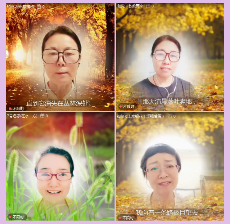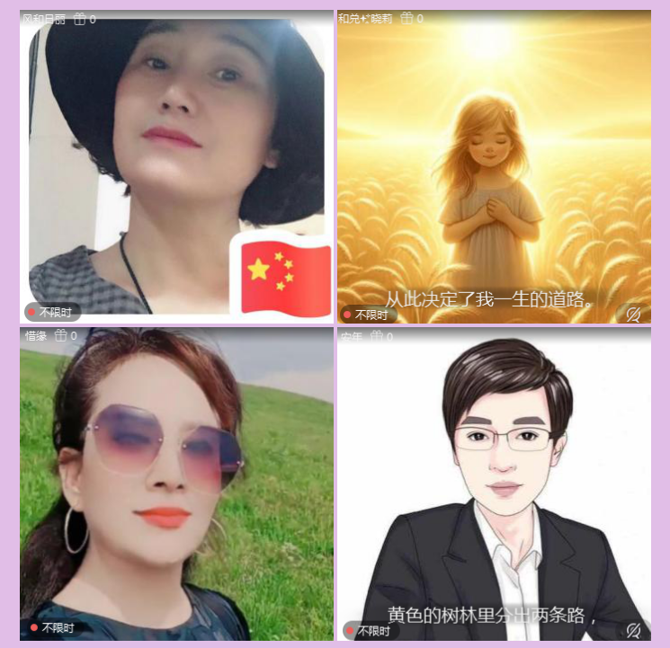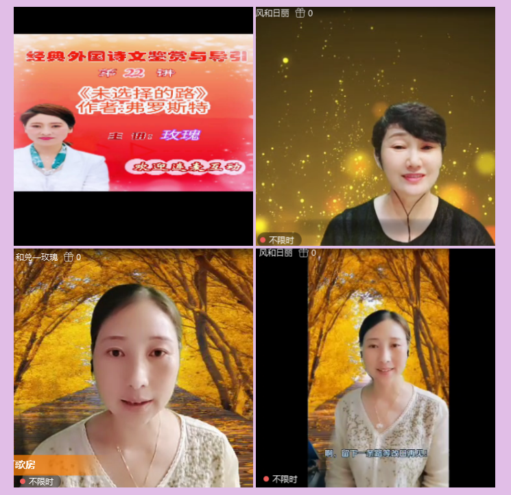 伴随着玫瑰老师诵读《未选择的路》视频播放,琪琪格、款款而来、水上银花、惜缘、晓莉、安年等诵友,先后上麦学习诵读了《未选择的路》。玫瑰老师一一给予诵者以鼓励和点赞。针对诵读中存在的不足和问题,以专业的视角一一给于耐心细致的点评,诵读这首诗歌的关键处和技巧使用,提出了自己的建设性意见和建议。待在开心学习中,共度了一段快乐的时光。如同主持风和日丽所感悟的那样,岁月如歌,同行你我,无论人生的选择道路千差万别,但珍惜当下,热爱生活。朗诵,我们不专业,我们却热爱。快乐的时光总是那么的短暂,相会的温馨,相聚浪漫,在诗情画意中让人流连忘返。本场活动在主持的美好祝愿中圆满结束。