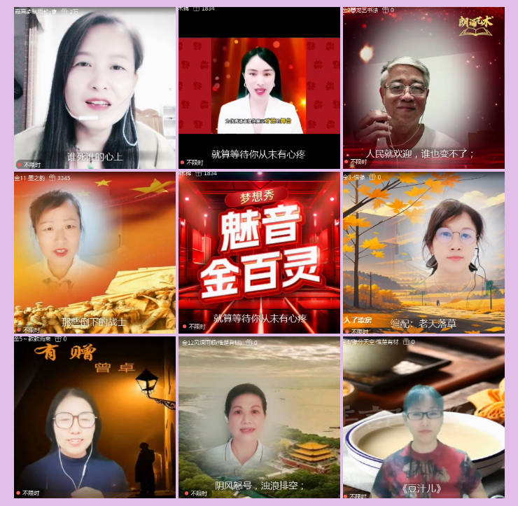 心手相牵,同声共情,唱出人生的精彩,诵出诗意的梦想。2024年8月25日20:00,在VV681735梦想秀家族歌房里,《梦想秀家族魅音金百灵》活动晚会温情开场。享誉VV平台的《魅音金百灵》品牌栏目,传承中华语言艺术,诵国学经典,为优秀诵者提供展示才艺的舞台。用你我的声音描绘精彩的世界,梦想秀大舞台欢迎你的到来。