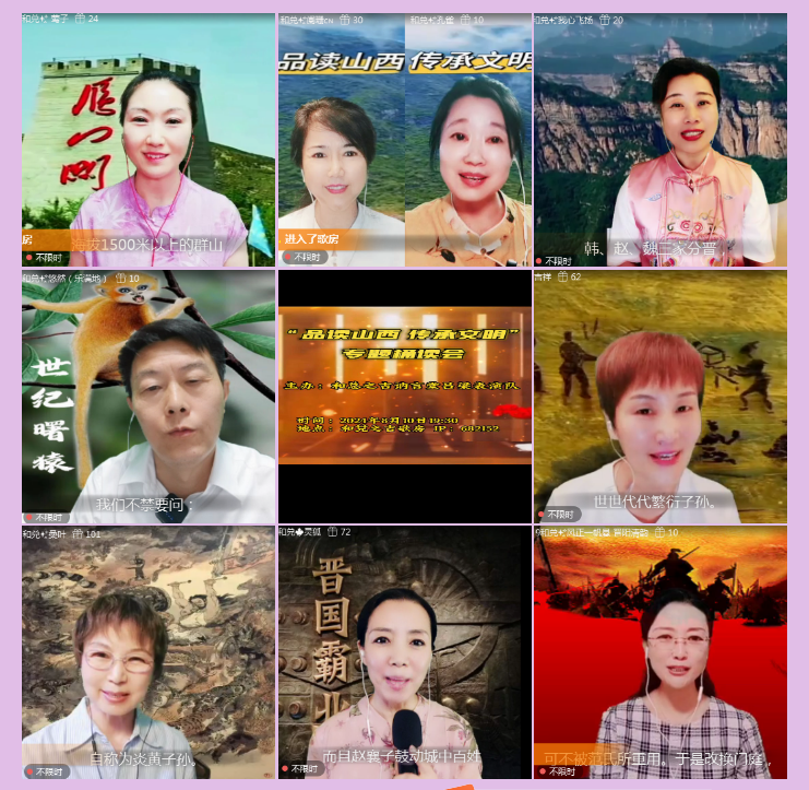 山之西,河之东,人之杰,地之灵。心手相牵,触摸华夏文明之根,解读三晋文化之源。20204年8月10日19:30,在VV682152和兑之吉家族歌房里,讷言堂吕梁表演队2024“品读山西 传承文明”专题诵读会盛大开场。来自讷言堂吕梁表演队的莺子队长(导演)携手十七位诵读精英,联袂演绎精彩,“用心吐字、为爱发声”中,呈现“表里山河”的风光无限,共享“华夏文明摇篮”的博大精深。& L# c1 |1 H! j( e