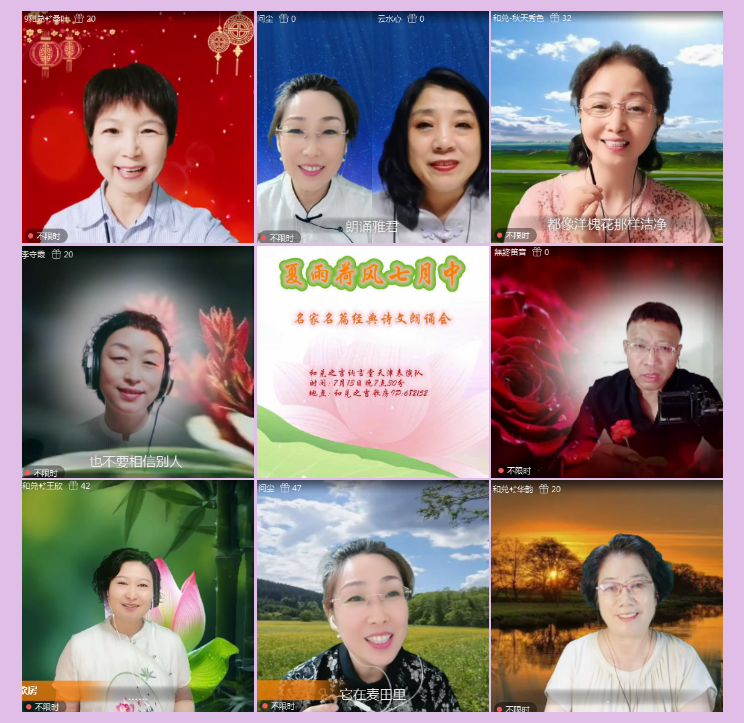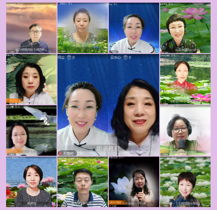 * H. I9 ^( P% {: j n 夏雨,诗意着清凉,荷风,浪漫着七月。朗诵会进入下篇《听荷绿正浓》:金色百合朗诵《莲的心事》、雅君朗诵《荷塘月色》、云水心朗诵《爱莲说》、一萍朗诵《残荷》、宋加菊朗诵《永远 等我》、暖风扶柳朗诵《等你,在雨中》、悠然乐满地朗诵《众荷喧哗》、心之朗诵《荷叶母亲》。导演桑叶朗诵《荷花》,为朗诵会演绎了最后的精彩。历时近2个小时,朗诵会在主持的温情答谢、美好祝愿声中完美落幕。