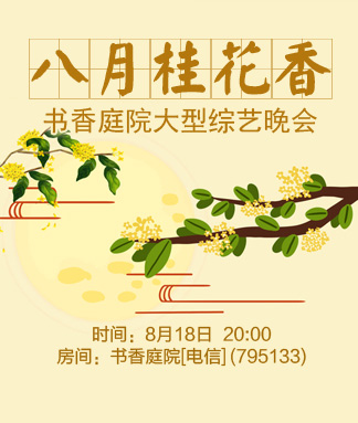 + S( C B- W% ]9 D! i7 O8 `活动名称:书香庭院八月桂花香大型综艺晚会 活动时间:2024年8月18日 20:00 活动地点:原创音乐天地-原创音乐天地时尚魅力-书香庭院[电信]-795133